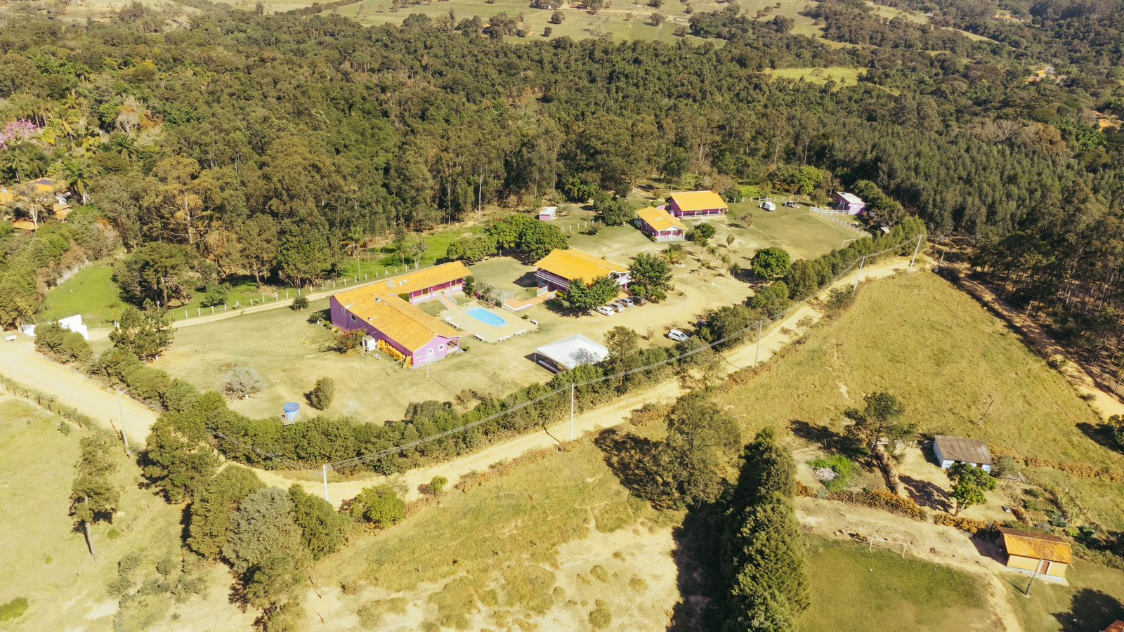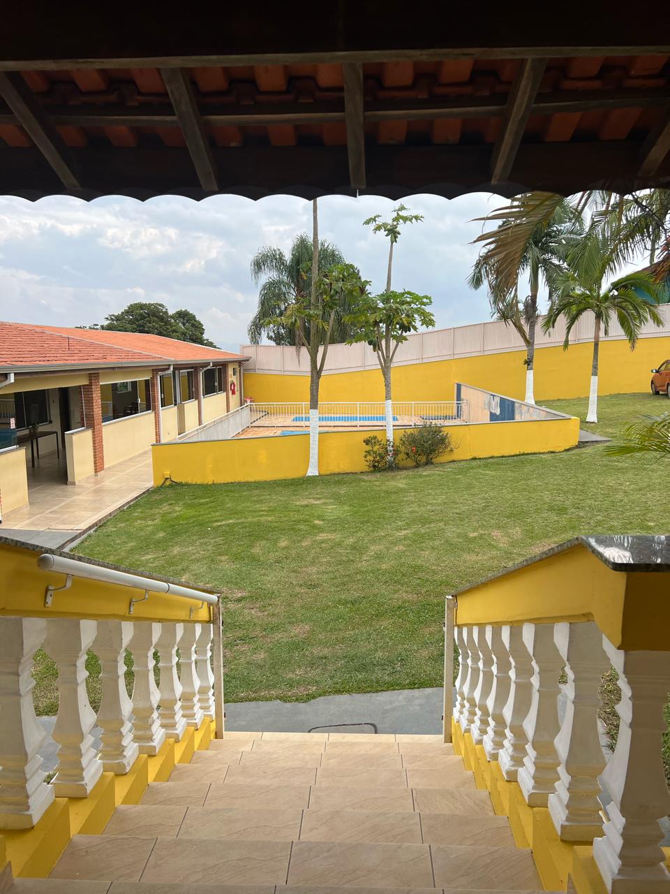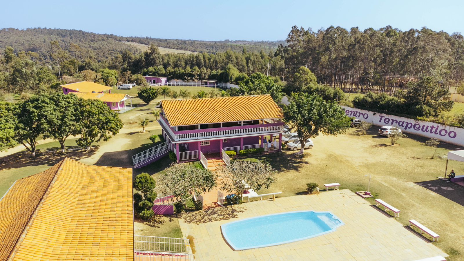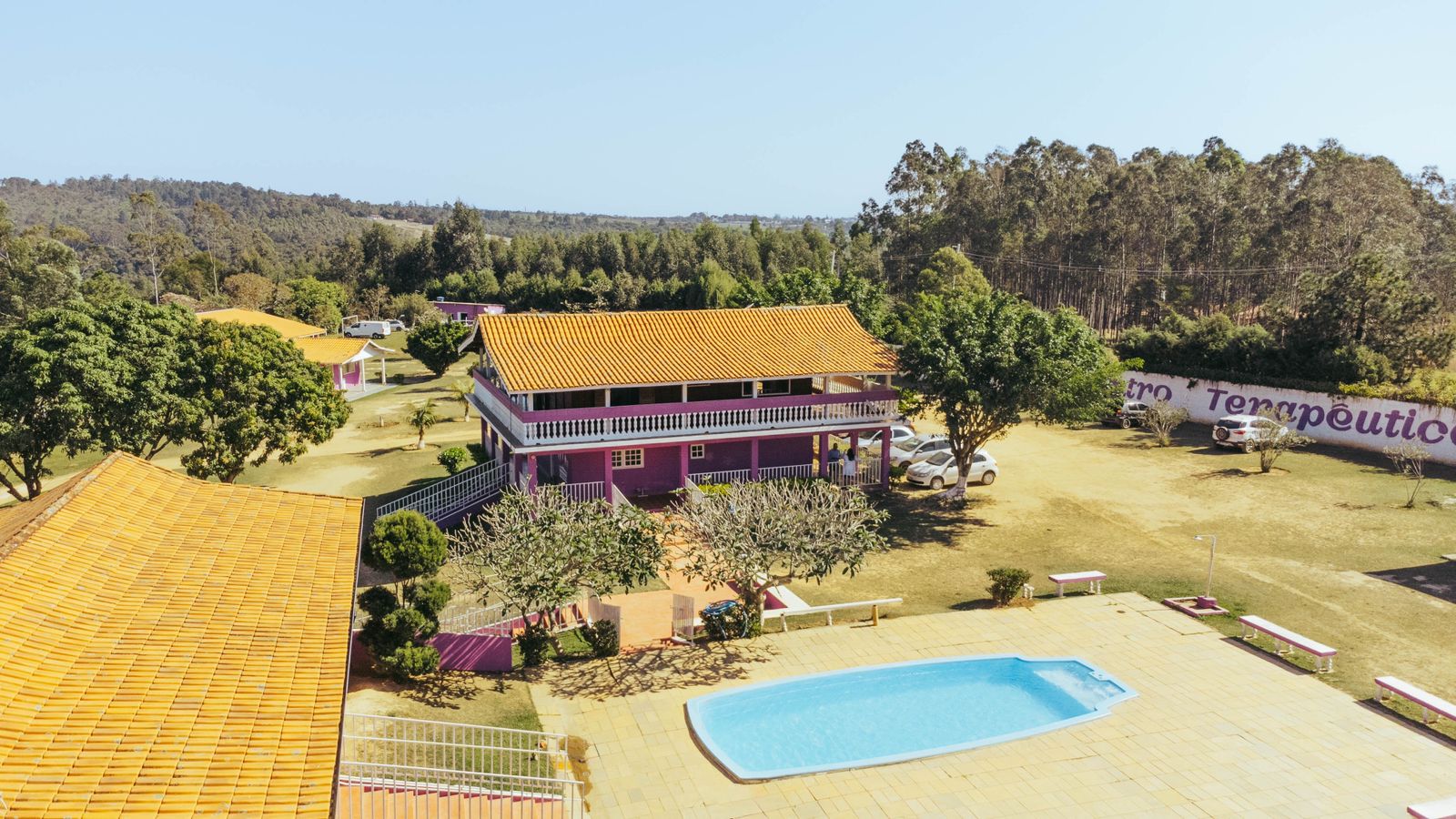 Ambientes equipados com piscina, academia, campo e quadra para esportes, refeitório, além de uma área ampla.